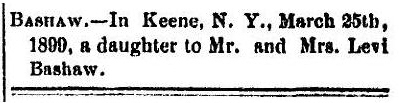 Surviving him are three sons, Solomon Bashant of Faust; Albert of Moorers Forks, and Clemis of Keeseville; one daughter, Mrs. Frank Favreau of Wells Bridge,; six brothers, Robert of Keene Valley, Louis and Joseph of Peru; Frank of Peasleeville, Fred of Willsboro; and Exave of North Brookfield, MA; and 3 sisters, Mrs. Thomas Snye of Piercefield; Mrs. Rose Beauleau of Munson, MA, and Mrs. Sam McGee of Peasleeville. The latter, the youngest surviving member of the family, is 57 years of age.