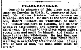 His father Oliver Bashaw, born in Canada and mother Katherine ------, we identify as Dandurand, born in Canada. So although there are some holes, I believe it is safe to assume this is our Gilbert. To add further support, the person who gave witness to the authenticity of the information supplied was Thomas Snye of Peaseeleville. Thomas is the husband of Mrs. Thomas Snye sister of Levi Bashaw [see obituary of Levi Bashant] thus making her the daughter of Robert [Gilbert] Bashaw. Thomas was witnessing the death certificate of his father-in-law.