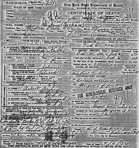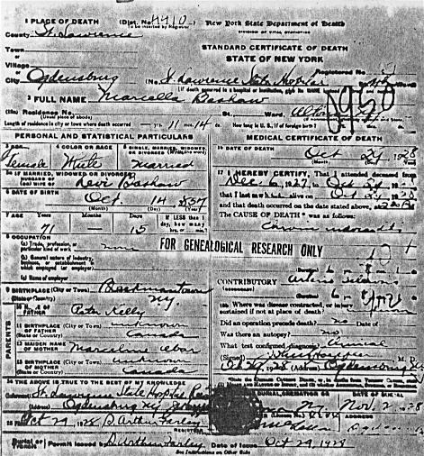 Below is the death certificate of Marcella Kelley Bashaw. She was married to Levi Bashaw. This death certificate was witnessed by the St Lawrence State Hospital [no name given]. She was born in Beekmantown and her father was Peter Kelly from Canada and her mother was Marceline Abear from Canada. She died at 71 in 1928 so she predeceased Levi by 8 years. She died from Chronic [undecipherable] and contributory factor was arterial sclerosis.