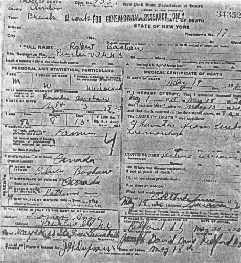 We also learn that this family member was a farmer, born in Canada, a resident of Peaseeleville and died at 86 of a cerebral hemorrhage.