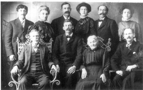 Louis Vertefeuille Bachand and Catherine Godney (seated), surrounded by their children. From upper left, Henry, Mary, Charles, Emma, Louis Jr., Maud, George, and Olivier.