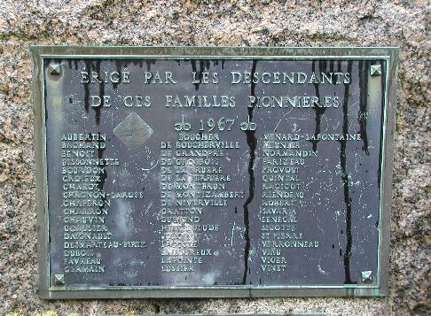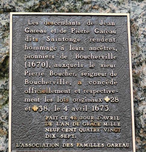 The Jean GAREAU and Pierre GAREAU's descendants with nickname Saintonge pay homage to their ancestors, pioneers of Boucherville ( 1670 ) to whom Mr Pierre BOUCHER, lord of the manor of Boucherville, has given/conceded officially and respectively the original shares # 28 and # 38, April 4,1673. Written/done this 4th day of April of grace's year 1997.