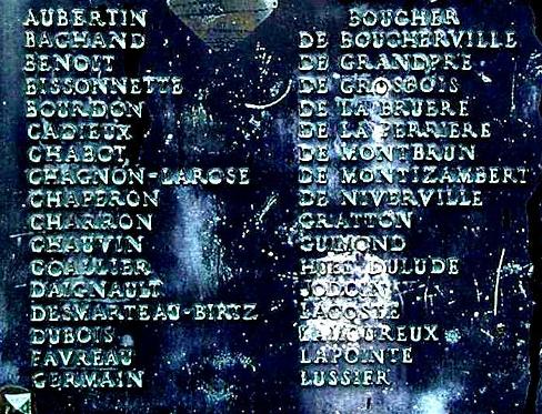There are two family names that are important to decendants of Nicholas Bachand dit Vertefeuille. Of course "Bachand" 2nd on the list honors Nicholas. But also honored is the family name Lamoureux, third from the bottom in the center column. This will be Louis Lamoureux, who became Nicholas' father-in-law when Nicholas married his daughter Anne.